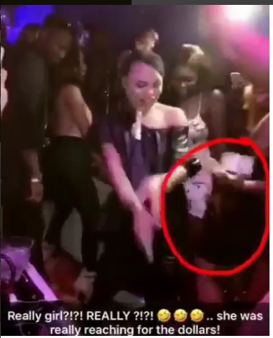 The lady pretending to be dancing with him was caught on tape stylishly reaching out to the dollars he was being sprayed by people!