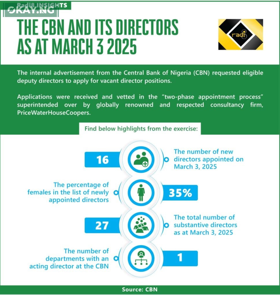At the end of the exercise 16 new directors were appointed on March 3, 2025 and they include: Dr. Rakiya Opemi Yusuf (Payment System Supervision Department), Dr. Adenike Olubunmi Ojumu (Medical Services Department), Dr. Aisha Isa-Olatinwo (Consumer Protection Department), Mrs. Rita Ijeoma Sike (Financial Policy and Regulation Department), Mrs. Monsurat Vincent (Strategy Management and Innovation Department), and Mrs. Omoyemen Avbasowamen Jide-Samuel from the Information Technology Department), Mr. Hamisu Abdullahi (Banking Services Department), Dr. Usman Moses Okpanachi (Statistics); Dr. Oboh Victor Ugbem (Monetary Policy); and Mr. Farouk Mujtaba Muhammad, (Reserve Management.), Mr. Olubukola Akinniyi Akinwumi (Banking Supervision), Hassan Ibrahim Umar (Development and Finance Institutions)