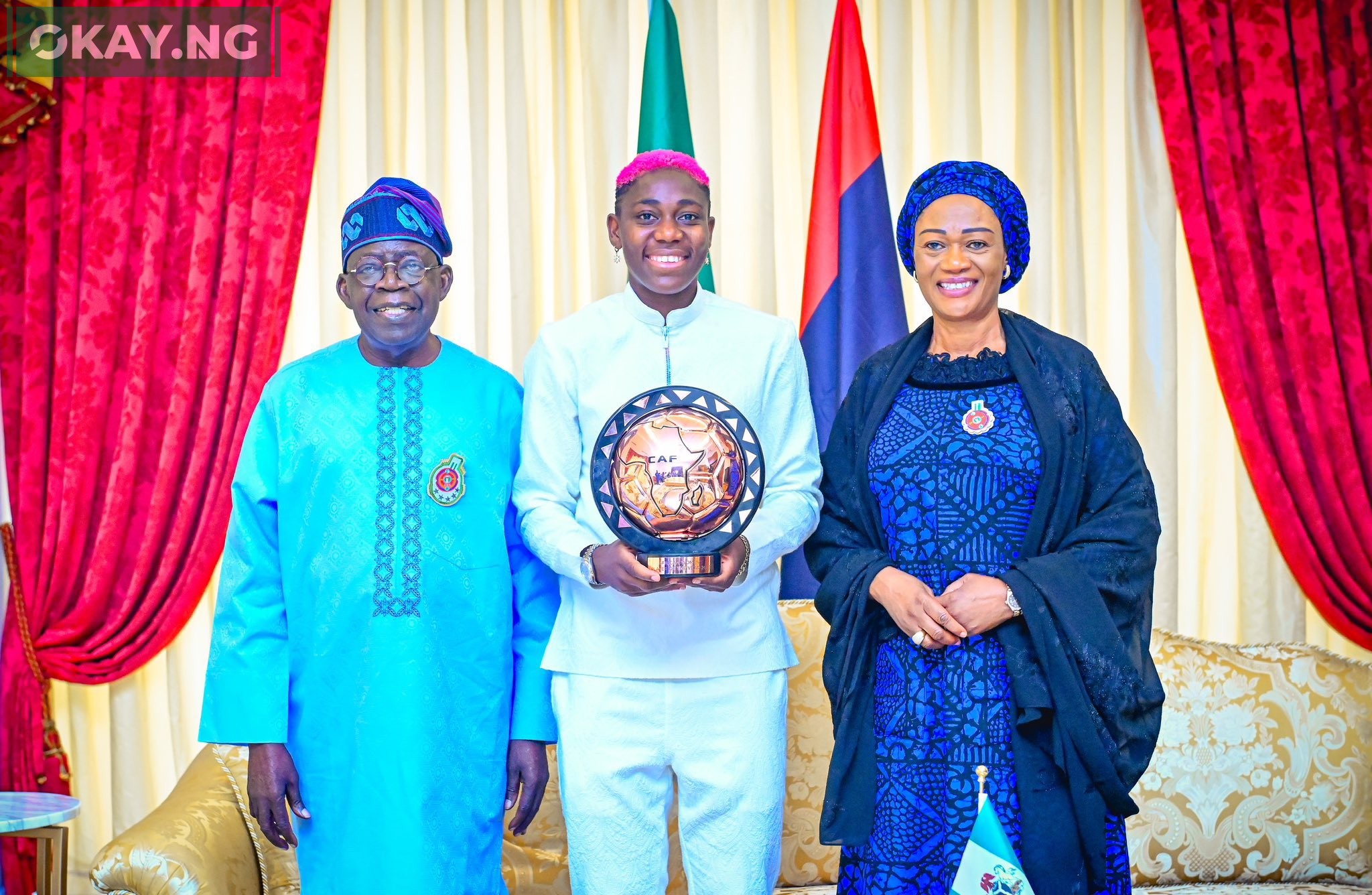 Nigerian footballer Asisat Oshoala on Thursday presented her award to President Bola Tinubu and First Lady Oluremi Tinubu in Lagos.