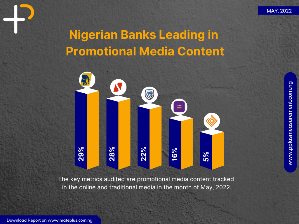 P+ Analytics carried out a Media Intelligence and Performance Audit in the month of May 2022, the audit critically analyzed and revealed the best performing Nigerian Banks judging by their promotional media exposure content tracked in the online and traditional media.