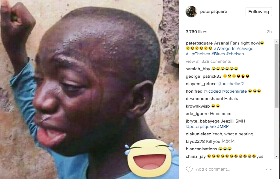 Nigeria music star Peter of P-Square mocked Arsenal fans after bowing 3-1 to Chelsea on Saturday.
