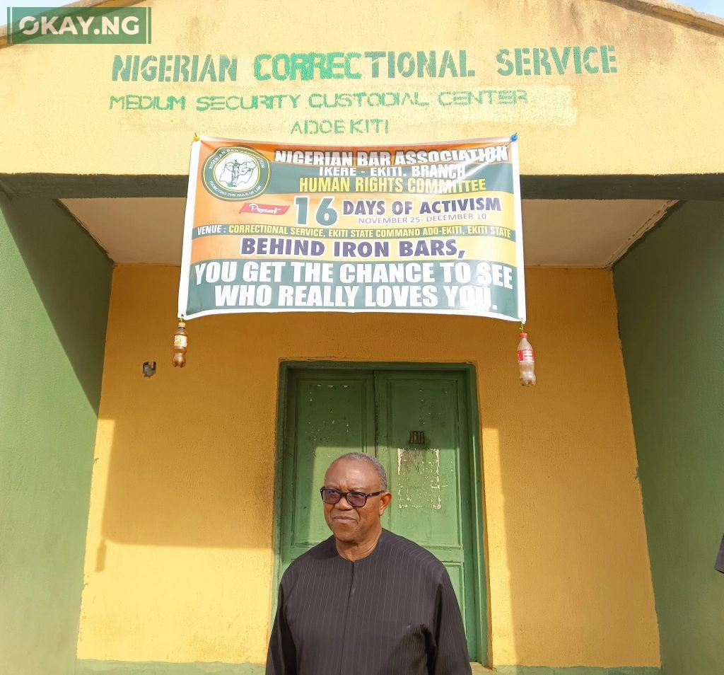 The LP candidate later proceeded to the Ado-Ekiti prison facility, where he met with Dele Farotimi, a human rights activist detained since last Tuesday. Farotimi is accused of disseminating false information against Afe Babalola.