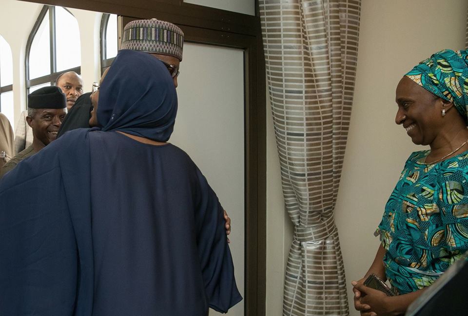 Wife of the President, Aisha Buhari warmly hugged her husband after his return from his medical vacation in London.