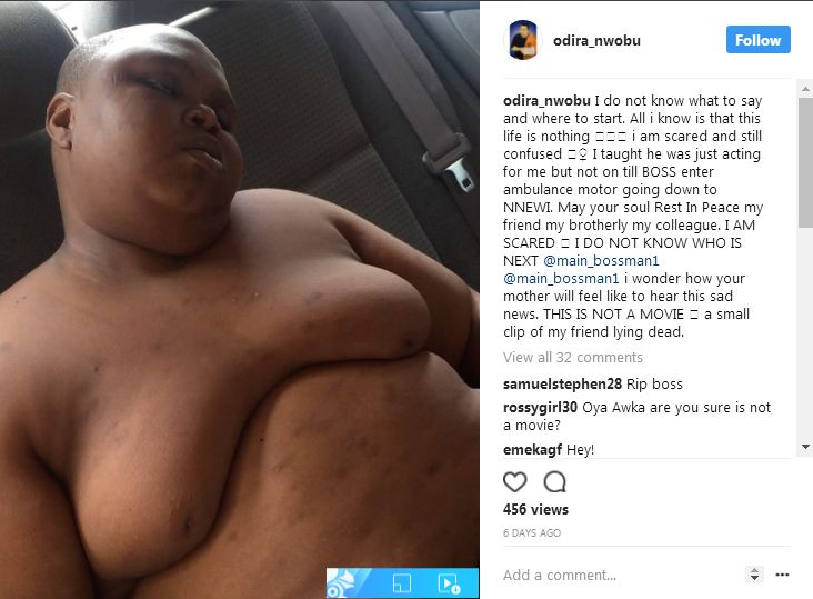 He captioned it: “I do not know what to say and where to start. All i know is that this life is nothing I am scared and still confused I taught he was just acting for me but not on till BOSS enter ambulance motor going down to NNEWI. May your soul Rest In Peace my friend my brotherly my colleague. I AM SCARED I DO NOT KNOW WHO IS NEXT @main_bossman1 @main_bossman1 i wonder how your mother will feel like to hear this sad news. THIS IS NOT A MOVIE a small clip of my friend lying dead.”