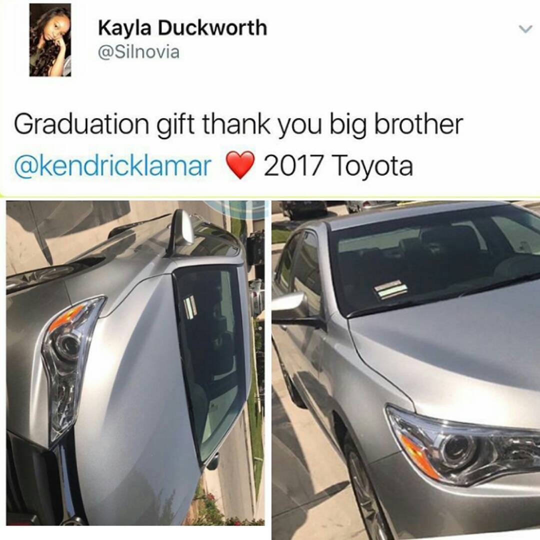 Kayla wrote in the caption, ‘Graduation gift thank you big brother@kendricklamar 2017 Toyota.’