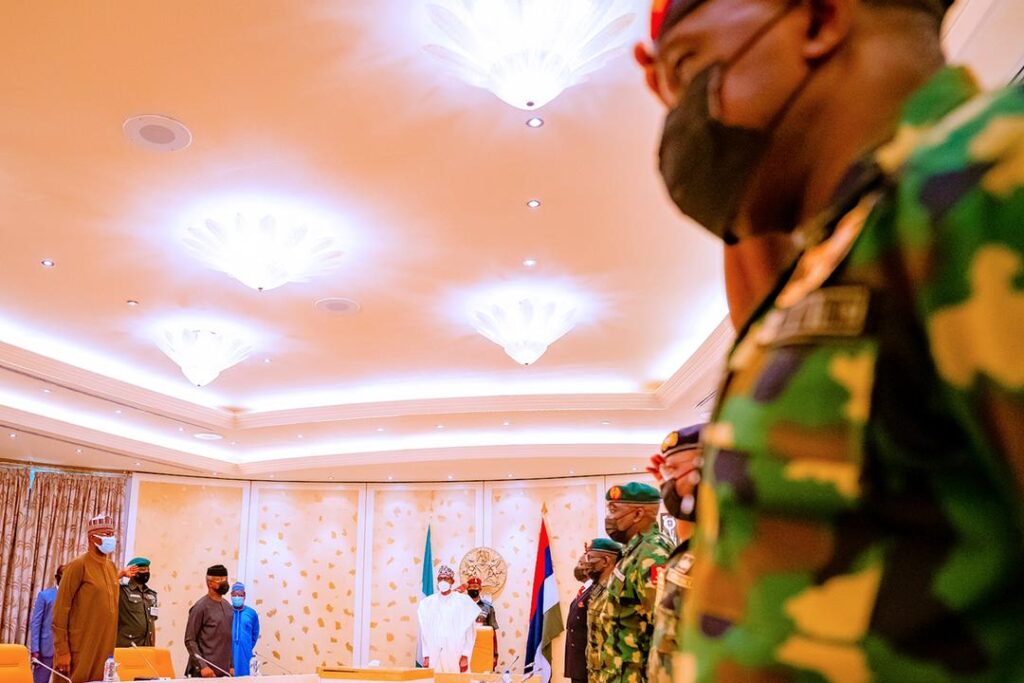 Also present are the Minister of Defence, retired Major-General Bashir Magashi; the National Security Adviser (NSA), retired Major-General Babagana Monguno; Chief of Defence Staff, General Lucky Irabor; Chief of Army Staff; Lieutenant-General Ibrahim Attahiru; Chief of Naval Staff; Vice Admiral Awwal Zubairu; Chief of Air Staff, Air Marshal Isiaka Amoo; and the acting Inspector General of Police (IGP) Usman Baba.