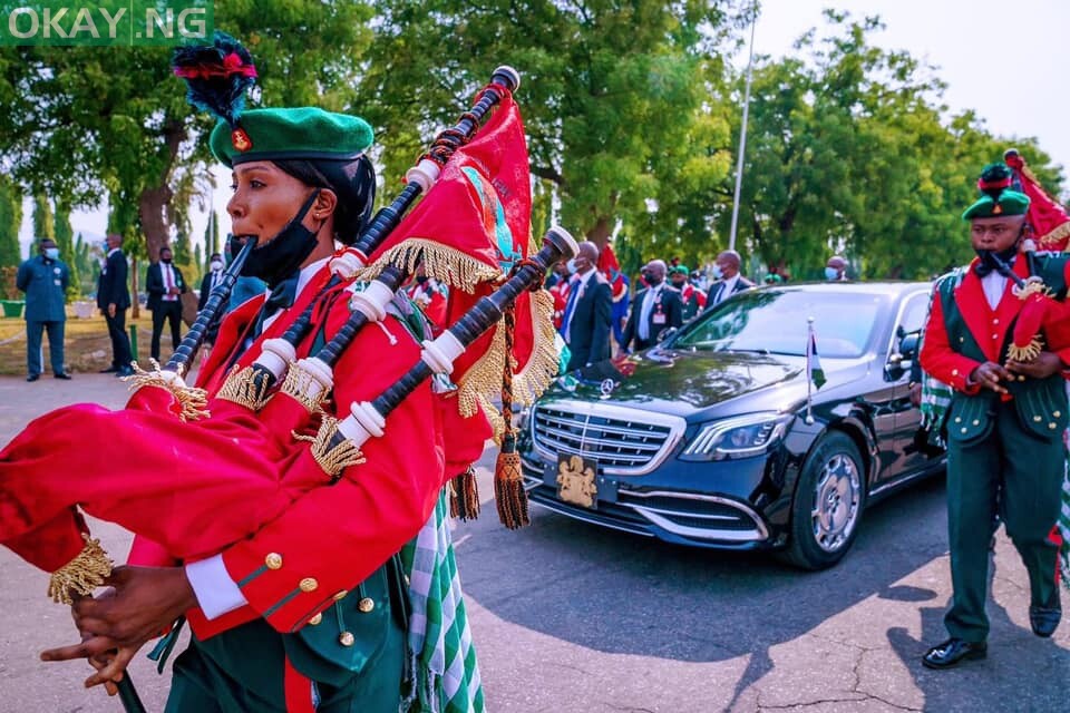 Buhari, who arrived the Arcade at about 10.05am had earlier inspected a guard of honour mounted by combined Army, Navy and Air Force personnel before laying the wreath at 10.28am.