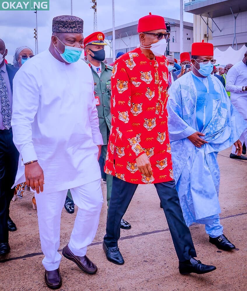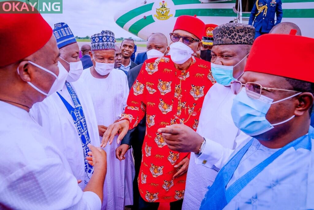 Mr Buhari was received by Governor Dave Umahi of Ebonyi and some governors of the ruling All Progressives Congress (APC) including the Chairman of the Progressive Governors Forum, Governor Atiku Bagudu of Kebbi, at the Akanu Ibiam International Airport Enugu.