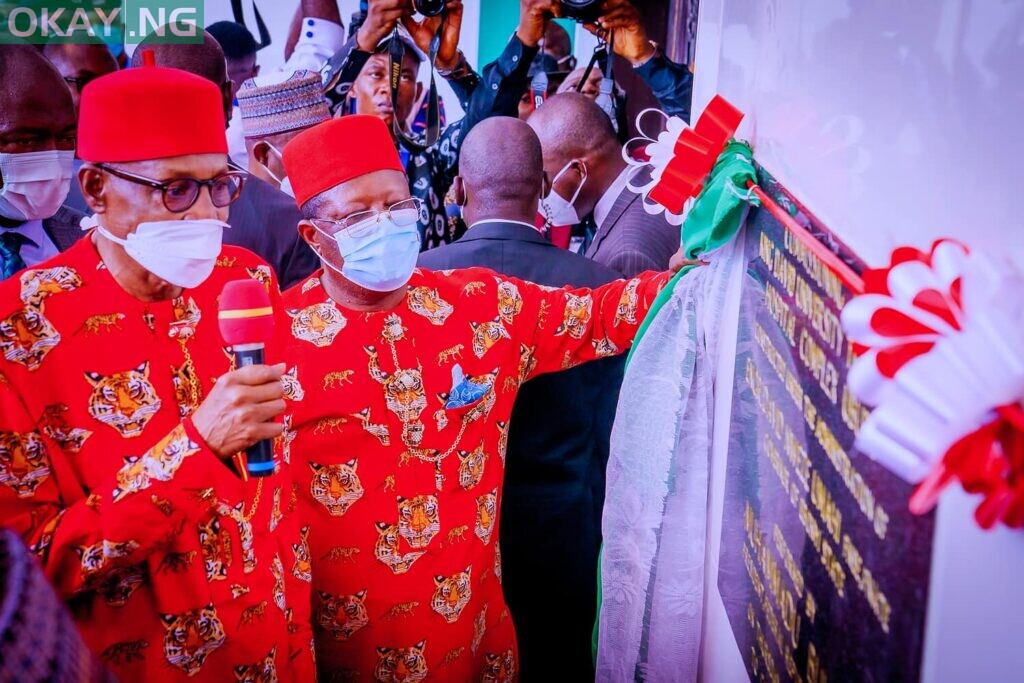 The president departed the airport for Uburu, where he inaugurated Twin Flyover, a 12 km dual carriage federal road from Mbu, Enugu State, to Uburu in Ebonyi State, as well as facilities and equipment at the university.