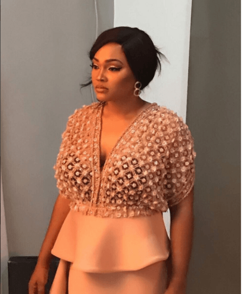 Beautiful Mercy Aigbe is seen glowing with a smile as she dazzles in the nude colour dress that sat perfectly on her body.