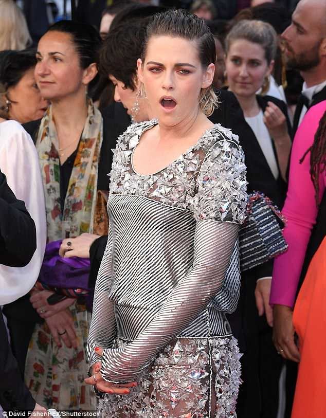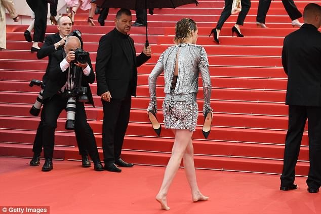 American actress, Kristen Stewart was caught taking off her Stiletto heel beneath the steps of the Palais des Festivals before proceeding on bare feet at the red carpet premiere of BlacKkKlansman during the 2018 Cannes Film Festival on Monday night.