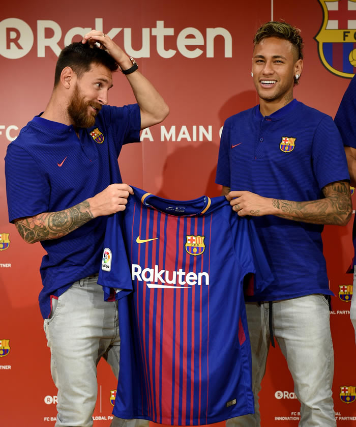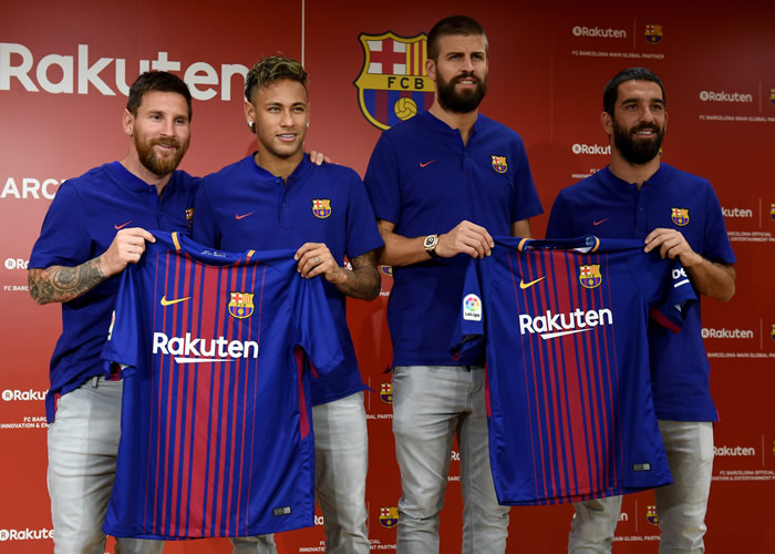 FC Barcelona players Lionel Messi, Neymar, Gerard Pique and Arda Turan, on Thursday, show off their new jersey with the Rakuten sponsorship logo for the first time during a press conference in Tokyo.