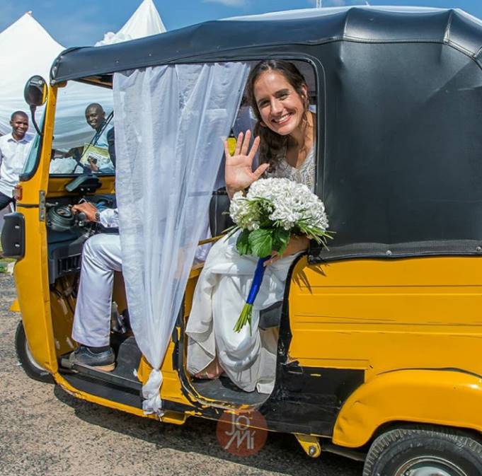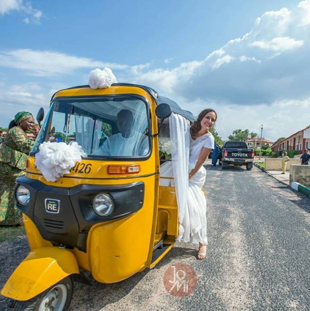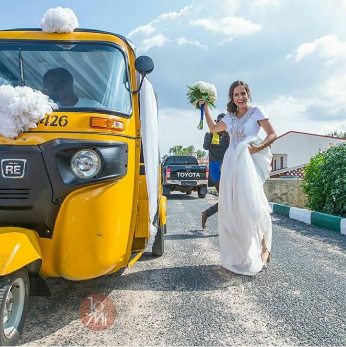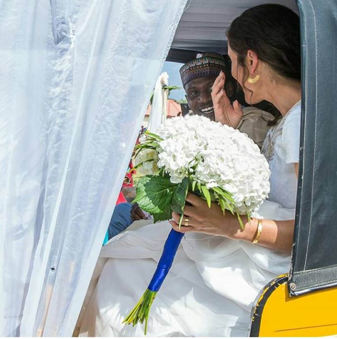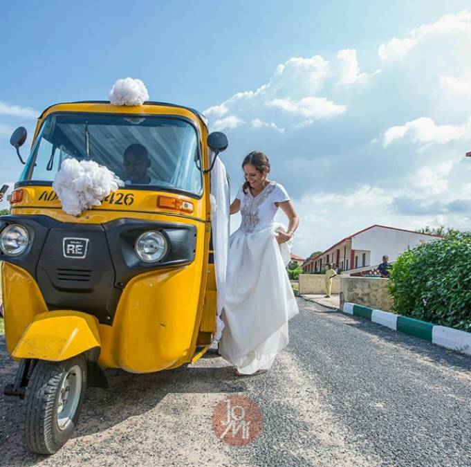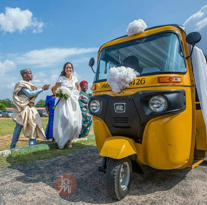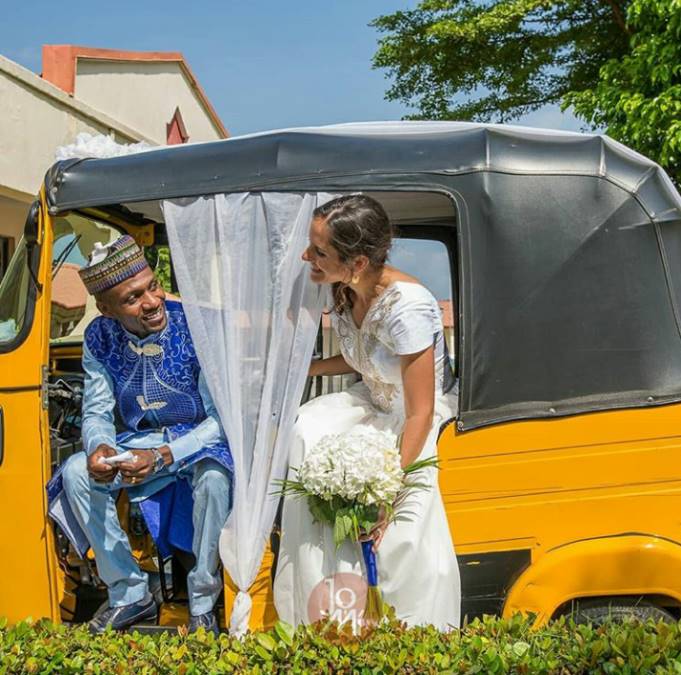 A Nigerian man, Maigalisa Yohanna, and his bride, Danielle Villasana, on Saturday, August 4, 2018, surprised many of their guests after storming their wedding reception in a tricycle in Yola, Adamawa.