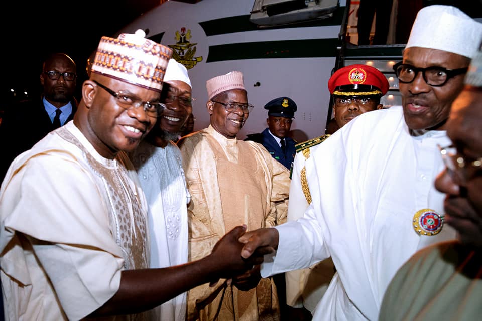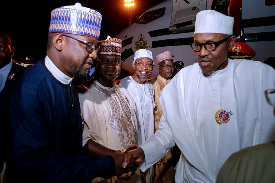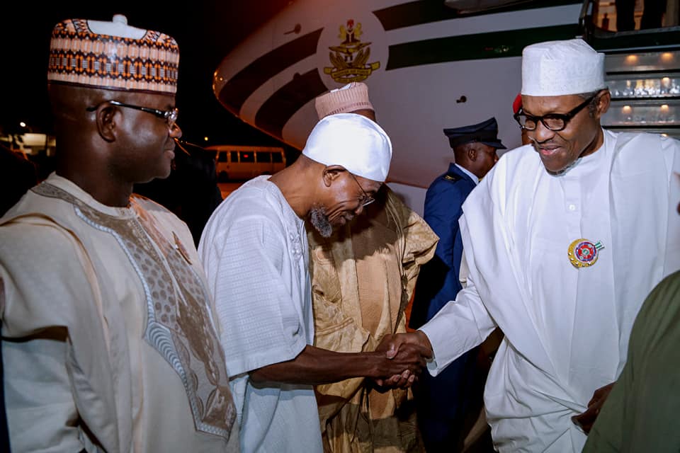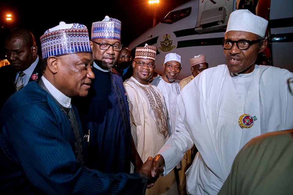 President Buhari with Minister of Defence Monsur Dan Ali, Governor of Niger State H.E. Abubakar Sani Bello, Governor of Kogi State H.E. Yahaya Bello, Governor of Osun State H.E. Rauf Aregbesola as he arrives Jordan ahead of Counter Terrorism Summit on 1st Dec 2017