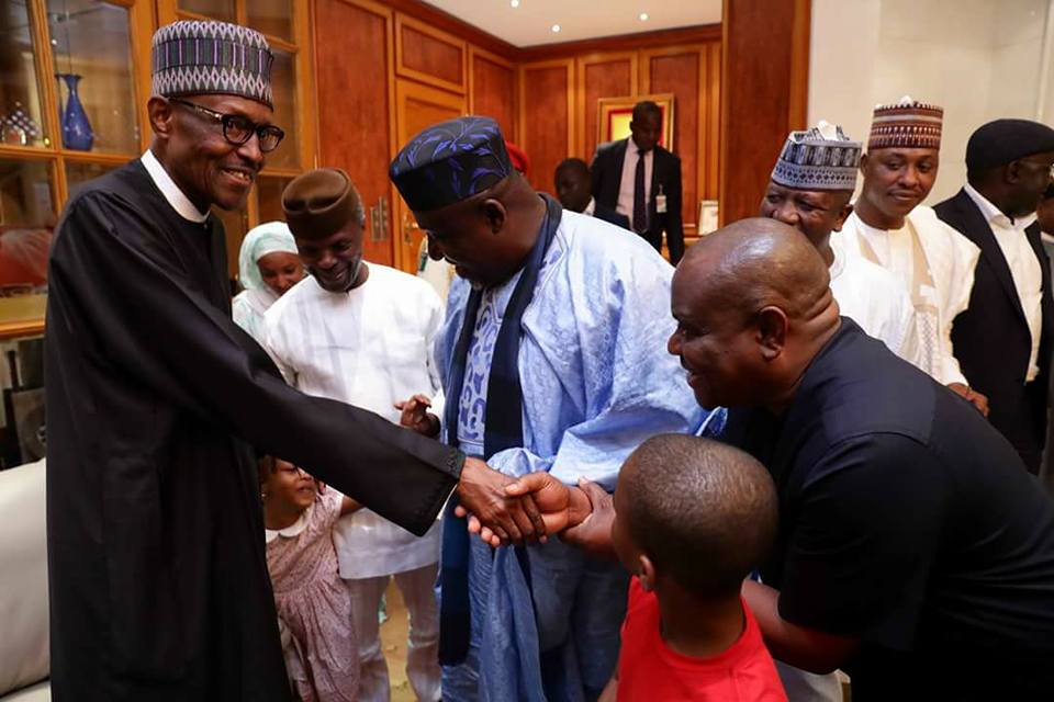 President Buhari is pictured below with his children and grandchildren at Aso rock after the news of his return stole first place on the trends chart.