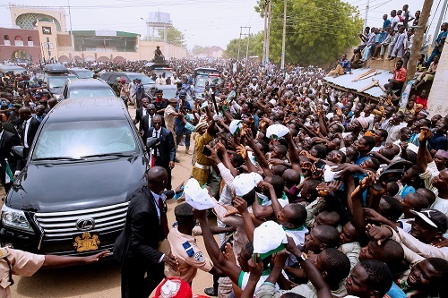 He was also welcomed by Jigawa state Governor, Muhammadu Badaru Abubakar and Kano state Governor, Abdullahi Umar Ganduje.