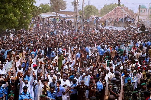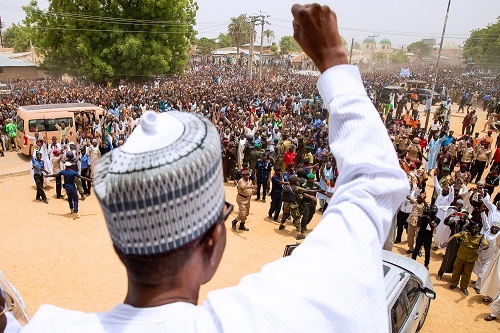Huge amount of people came out en masse to welcome President Muhammadu Buhari as he arrive Jigawa state for his 2-day official visit. The crowd cheered and waved at the President as he smiled at them.