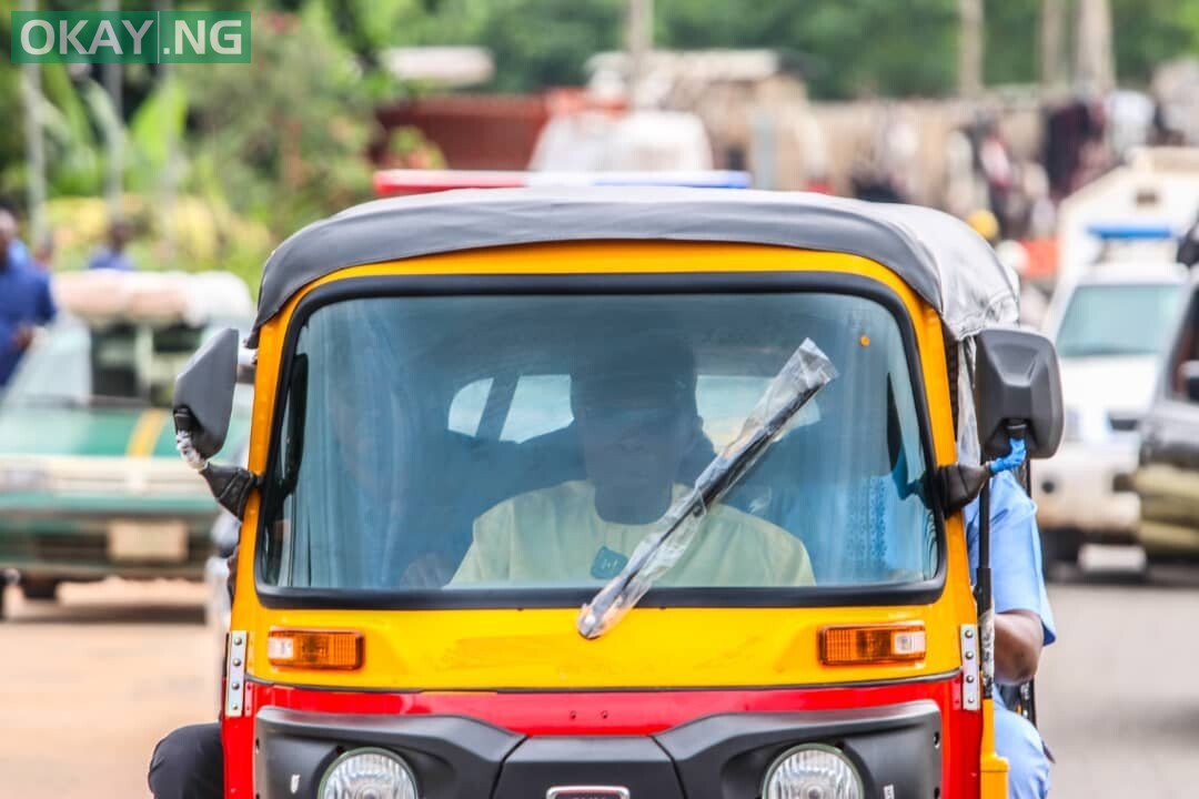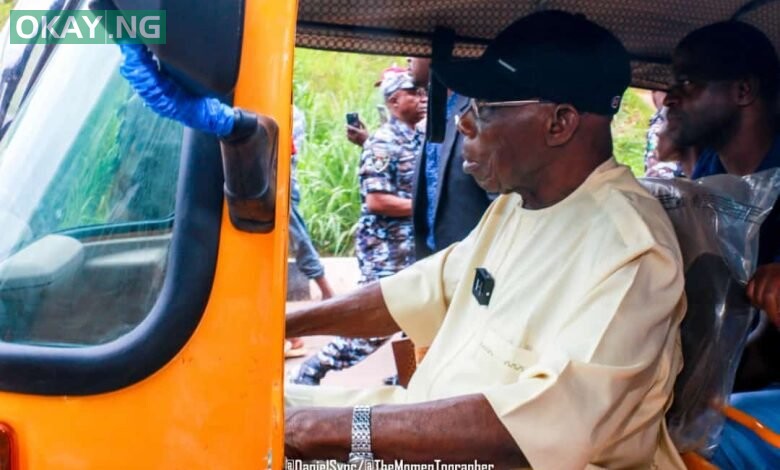Okay.ng reports that Obasanjo rode the tricycle from the premises of the Olusegun Obasanjo Presidential Library through Kuto under bridge, amidst greetings and jubilation by onlookers along the road.