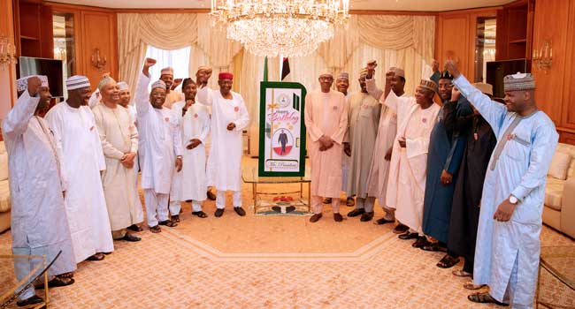 The President’s aides, led by his Chief of Staff Abba Kyari and Permanent Secretary of the State House Jalal Arabia, also presented him with a huge card which they all signed congratulating him on the special occasion and wishing him well.
