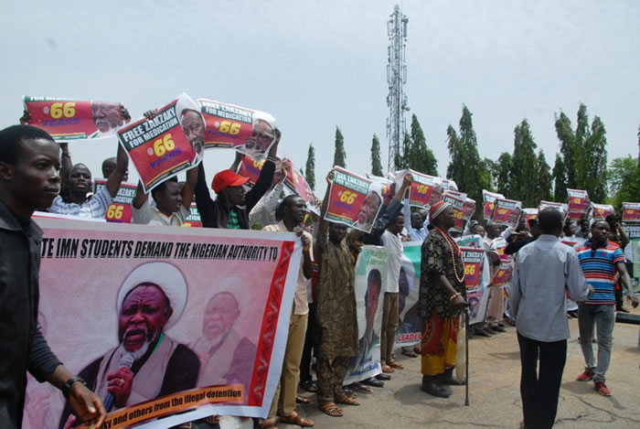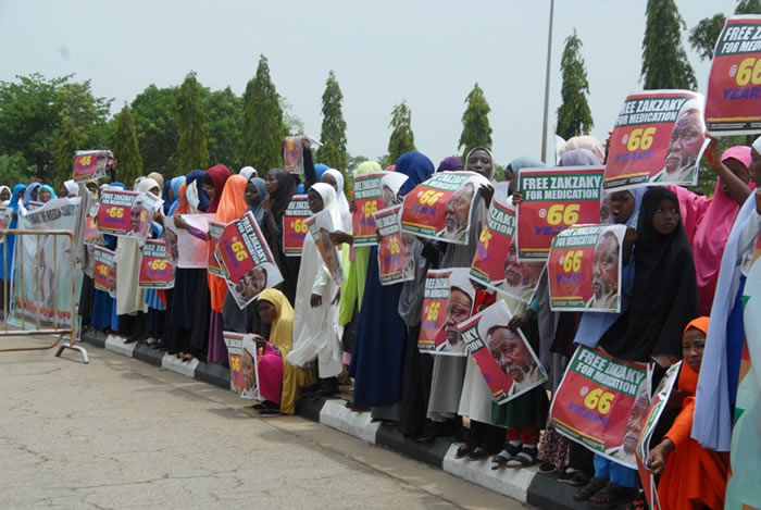 Members of the Academics Forum of the Islamic Movement in Nigeria on Wednesday protested at the entrance of the National Assembly complex, Abuja, demanding the release of their leader, Ibrahim El-Zakzaky and his wife, Zeenah.