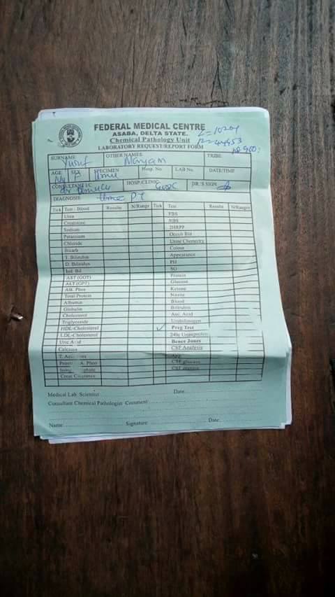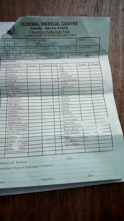 Attached here is the hospital patient card where innocent Maryam was taken and various tests were conducted, and it was ascertained she was raped beyond human imagination and left with a raptured vagina.