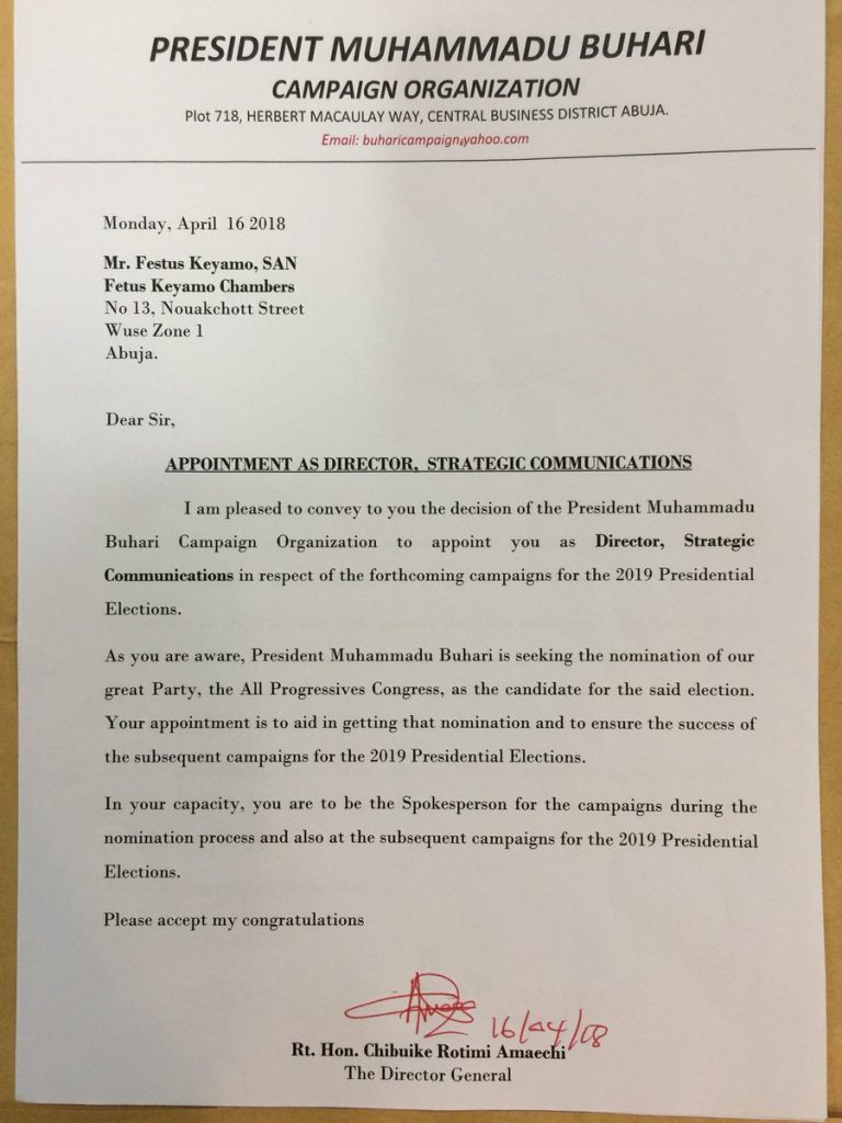 He wrote:”With this letter below👇, I have just been appointed the Director, Strategic Communications (Official Spokesperson) for the President’s 2019 Presidential Campaigns. I will be making a formal statement on this much later.”