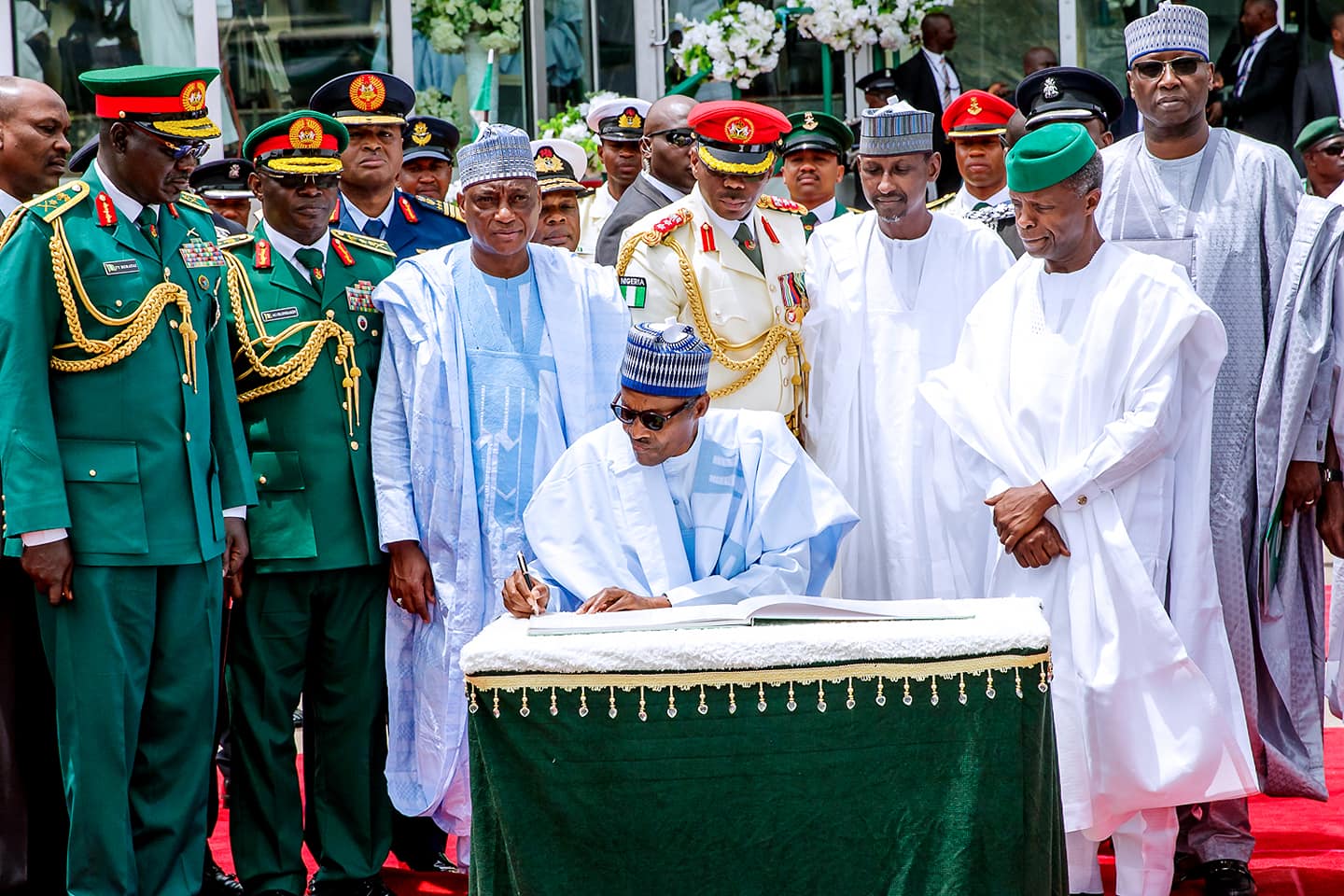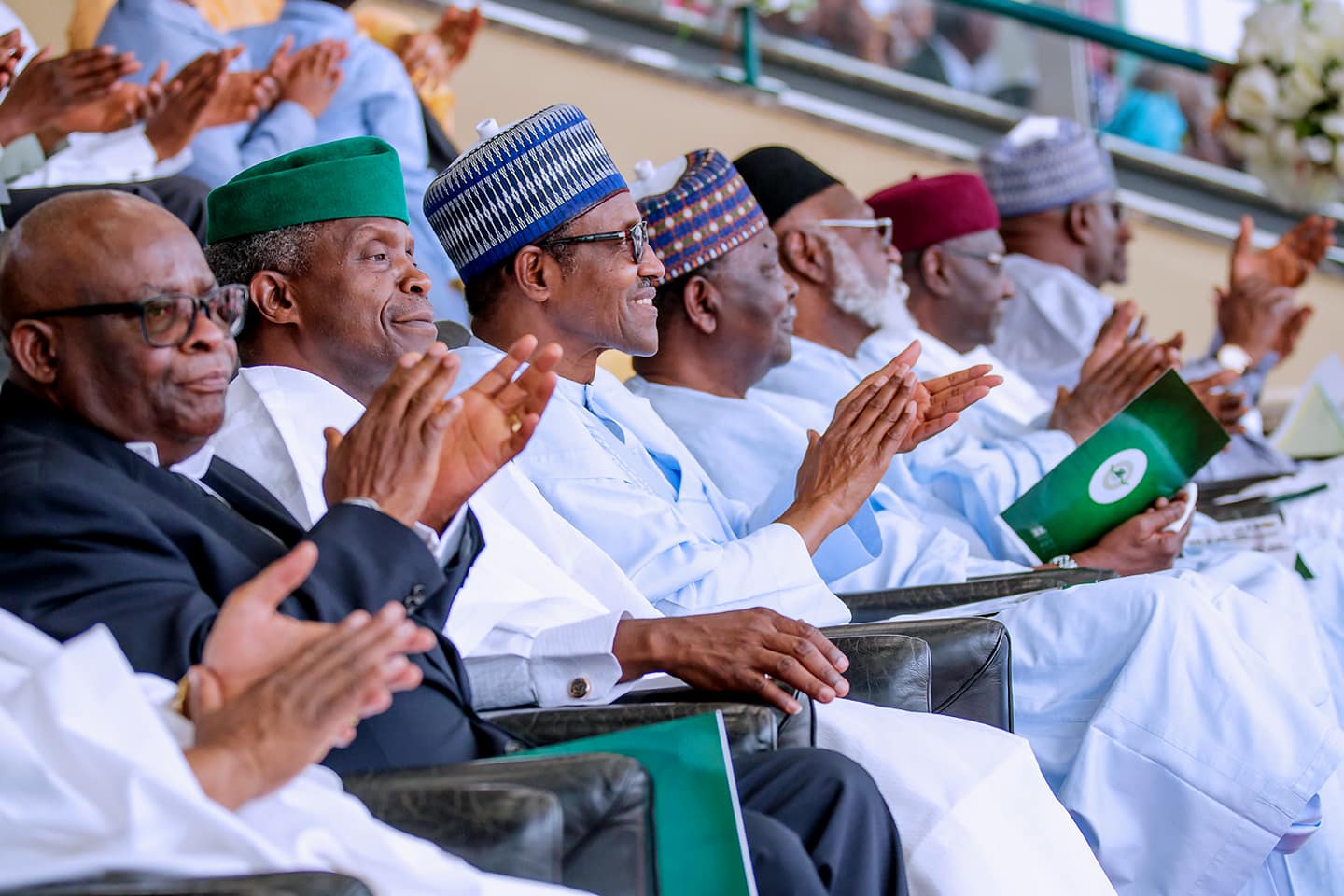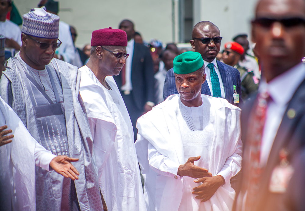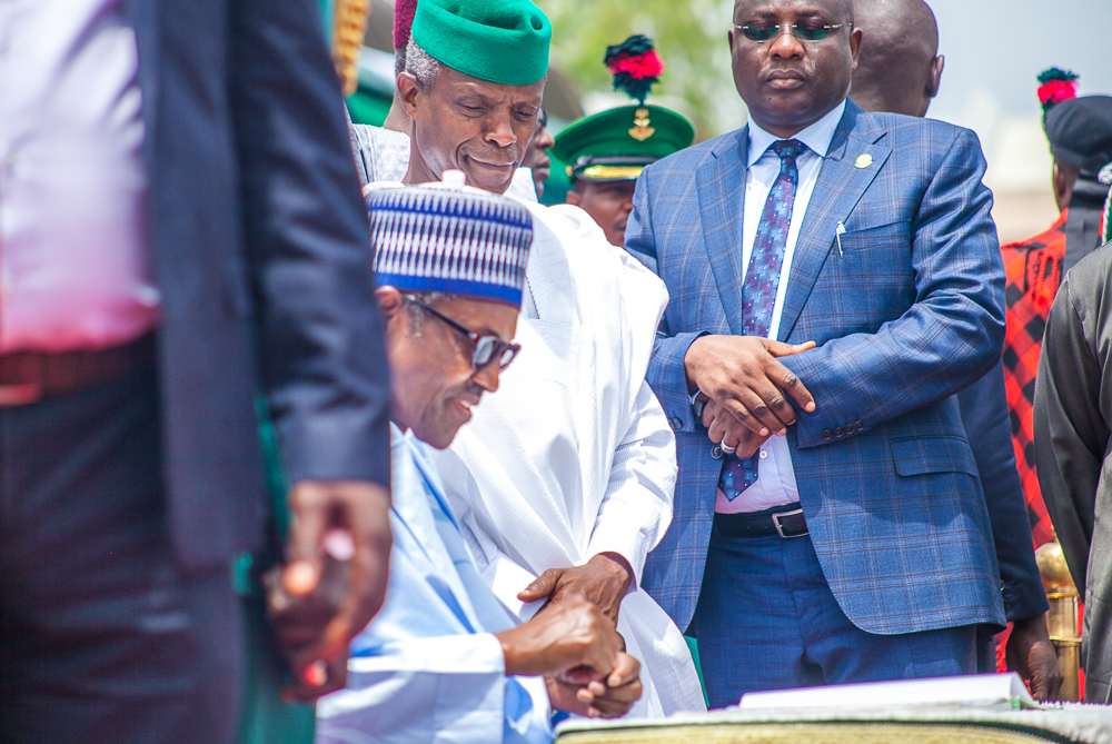President Muhammadu Buhari and Vice-President Yemi Osinbajo, SAN, alongside former military leaders: Gen. Yakubu Gowon (retd.) and Gen. Abdulsalami Abubakar (retd.) attend the 58th Independence Day Celebration Parade.