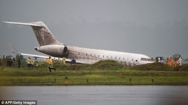 The jet carrying 11 people was due to leave Tacloban airport just minutes after the Pope’s plane left for Manila when its front tyres blew and overshot the track.