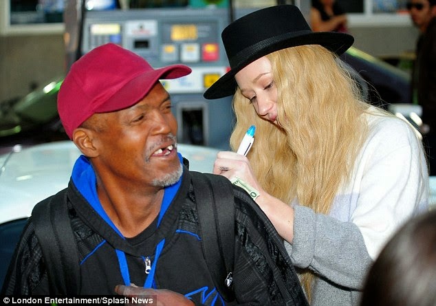 Iggy – born Amethyst Kelly – took a $20 bill from her wallet and autographed it on the back of her needy new friend.