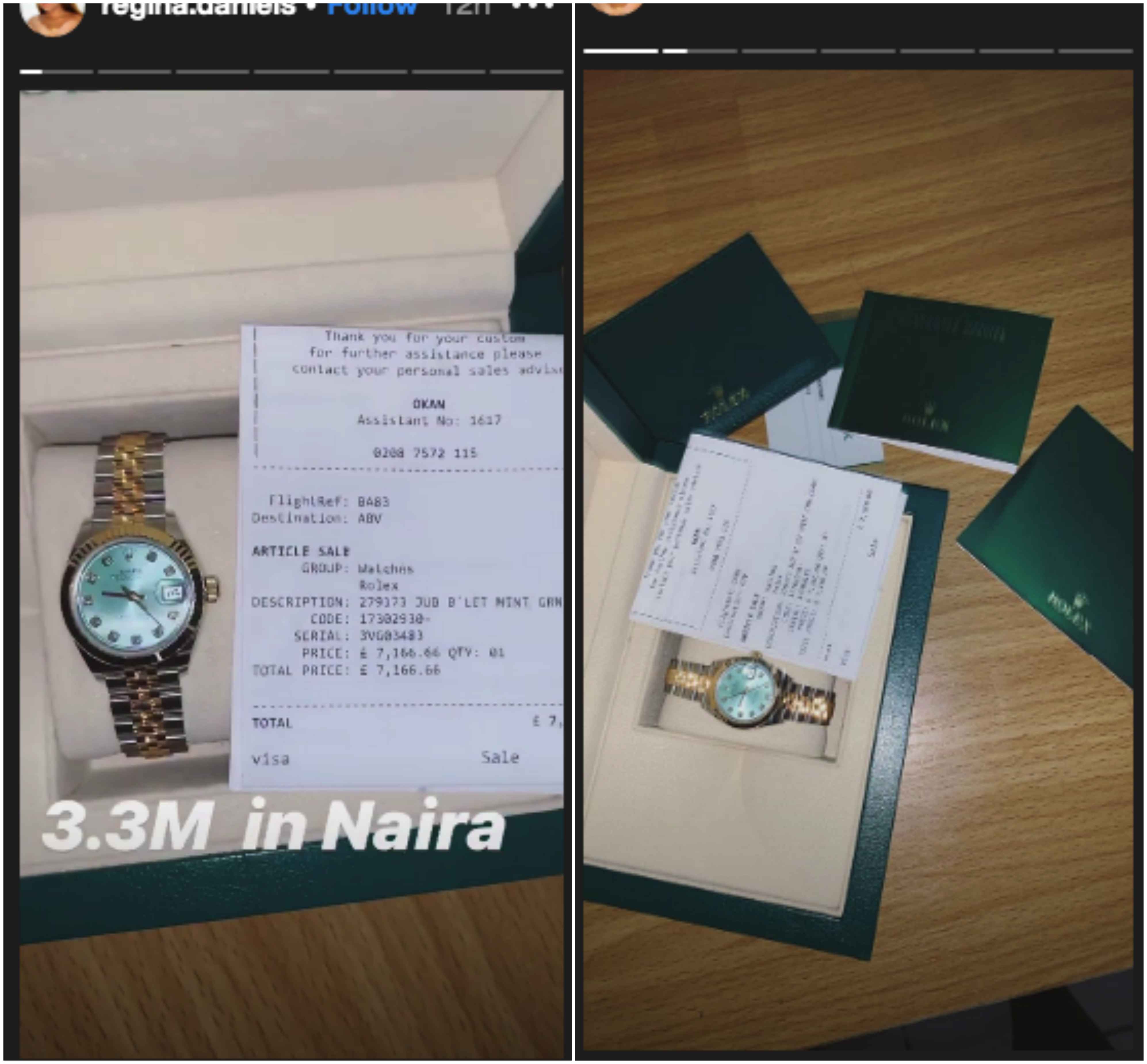 Regina Daniels, Nigerian Nollywood actress, caused a little commotion on social media as she show off her newly acquired Rolex wristwatch.