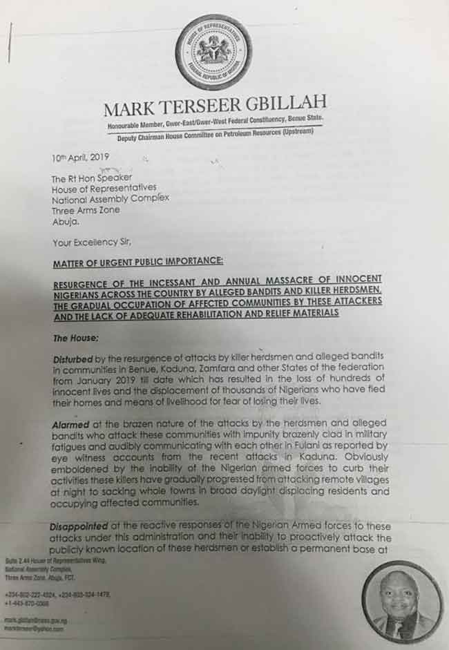 Gbillah said while forwarding his motion that the House was concerned by increasing attacks by ”killer herdsmen and alleged bandits in communities in Benue, Kaduna, Zamfara and other states from Jan. till date.”
