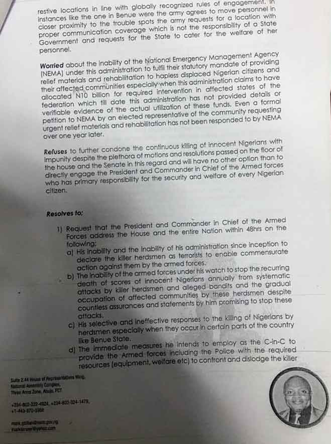 “The House is alarmed at the brazen nature of the attacks by the herdsmen and alleged bandits who attack these communities with impunity brazenly clad in military fatigues and audibly communicating with each other in Fulani as reported by eyewitness accounts from the recent attacks in Kaduna.