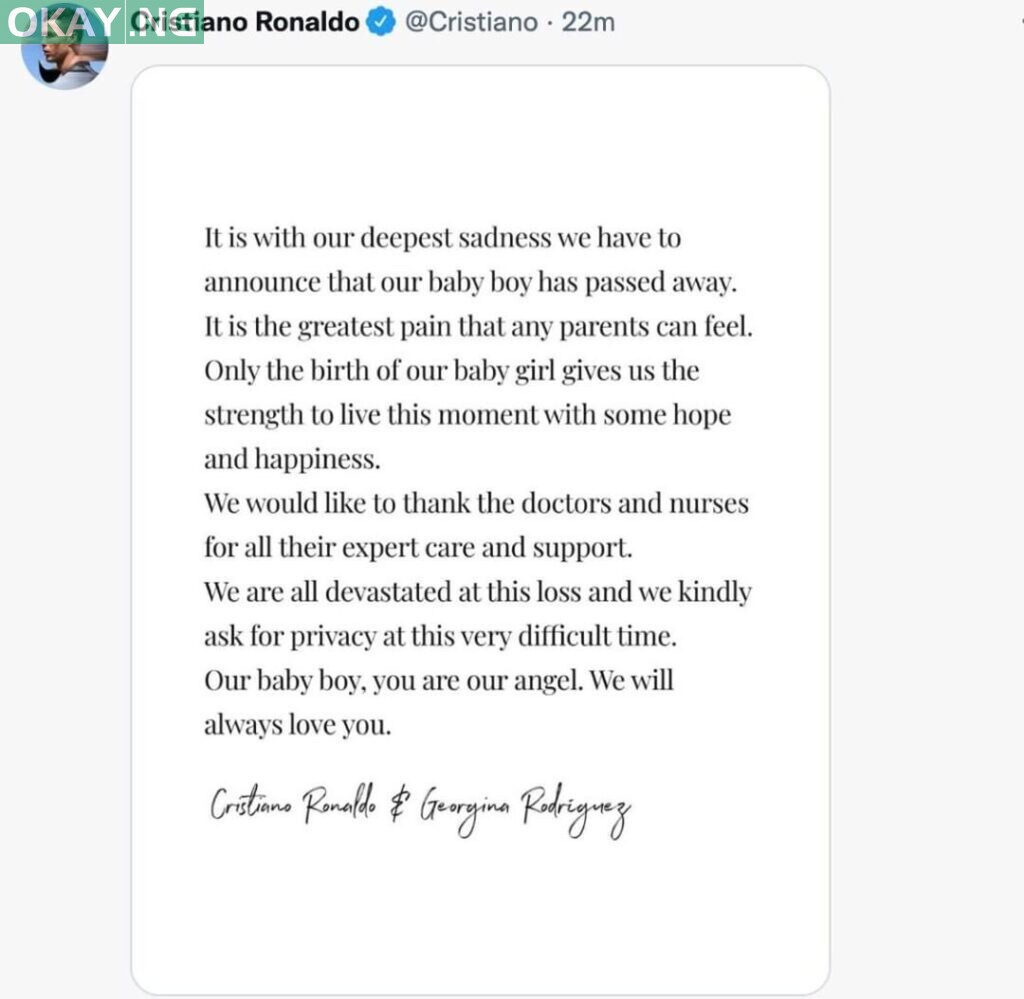 Manchester United Player, Cristiano Ronaldo has asked for privacy after he announced the death of his newborn son.