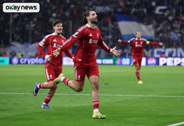 Okay News reports that Liverpool manager Arne Slot’s side extended their unbeaten run to 13 games with a disciplined display against the French outfit. Dominik Szoboszlai broke the deadlock in first-half stoppage time with a moment of brilliance, rolling a clever free-kick underneath the Marseille defensive wall to leave goalkeeper Gerónimo Rulli stranded.