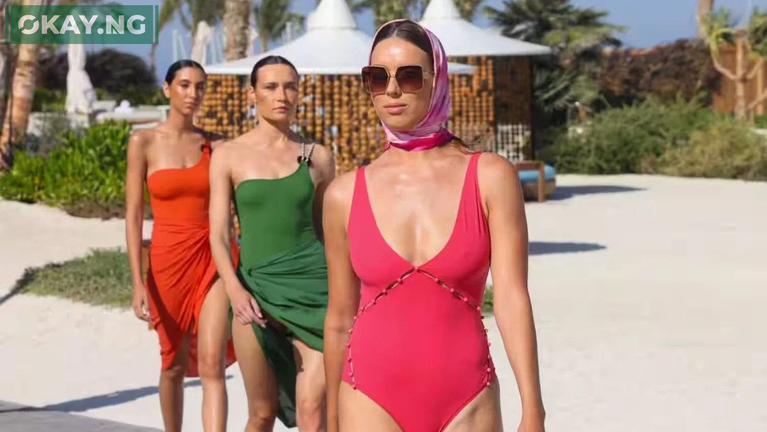 The collection, predominantly comprising one-piece swimsuits in vibrant shades of red, beige, and blue, highlighted exposed shoulders and partially visible midriffs, reflecting a blend of elegance and modernity.