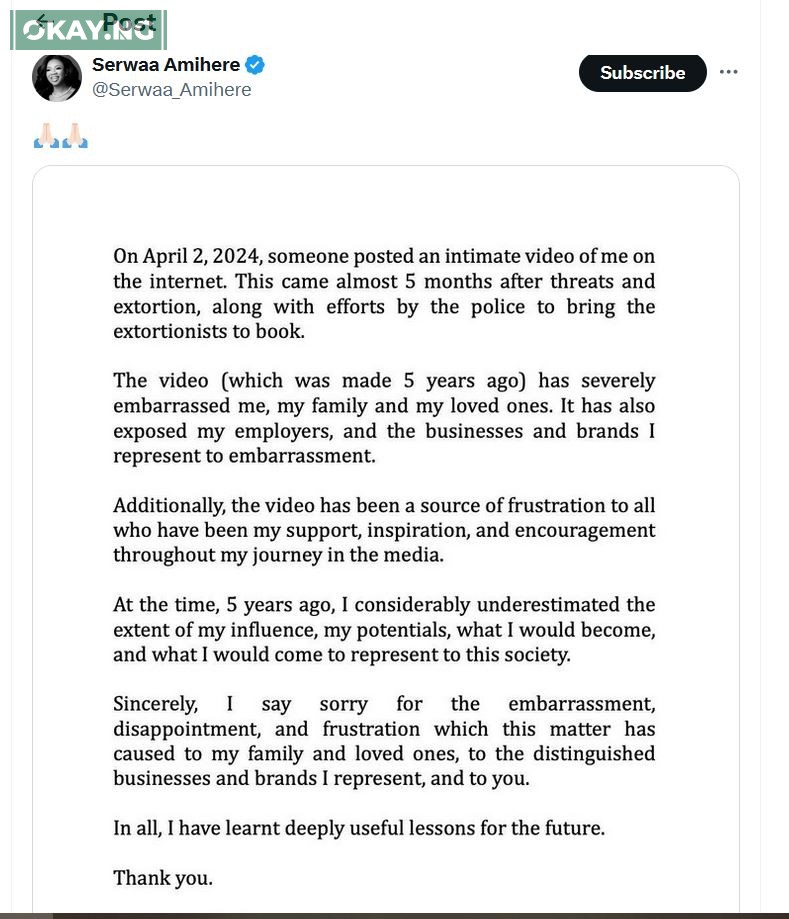 She wrote, “On April 2, 2024, someone posted an intimate video of me on the internet. This came almost 5 months after threats and extortion, along with efforts by the police to bring the extortionists to book”.