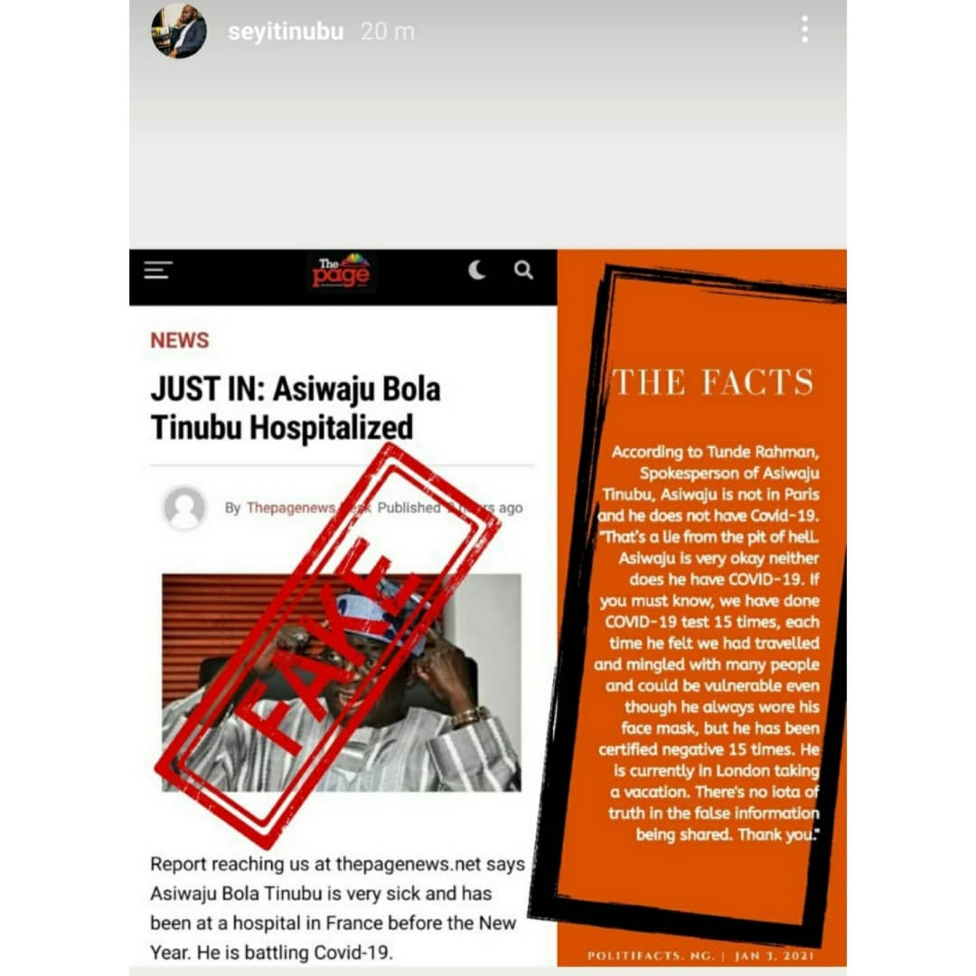 Seyi Tinubu, son to prominent politician, Bola Tinubu has deniee reports saying the old man has tested positive for COVID-19 and is currently receiving treatment in Dubai.