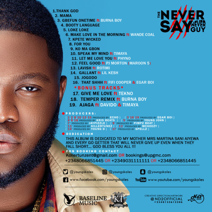 The 19-track album features Burna Boy, Wande Coal, Timaya, Phyno, PJ Morton (Maroon 5), Rotimi, Lil Kesh, Fifi Cooper, Egar Boi and Davido. The LP comes with three bonus tracks made up of his previously released singles.