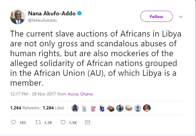 Ghana’s President, Nana Akufo-Addo, says the recent report on sales of African migrants in Libya is a mockery of the African solidarity.