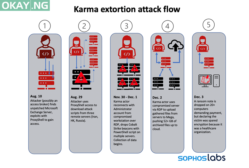 - The Karma attackers dropped an extortion note on 20 computers, demanding a ransom and explaining that they did not encrypt the data because the target was a healthcare provider