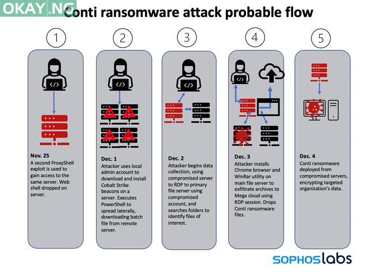 While Sophos was onboarding, Conti deployed its ransomware on Dec. 4, 2021. Sophos subsequently tracked the start of the Conti attack to another ProxyShell exploit leveraged on Nov. 25, 2021.