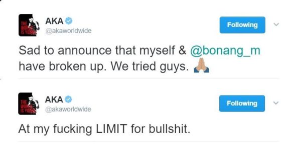 Kiernan Jarryd Forbes popularly known as AKA announced on his Twitter handle that he’s broken up with his girlfriend, Bonang Matheba.