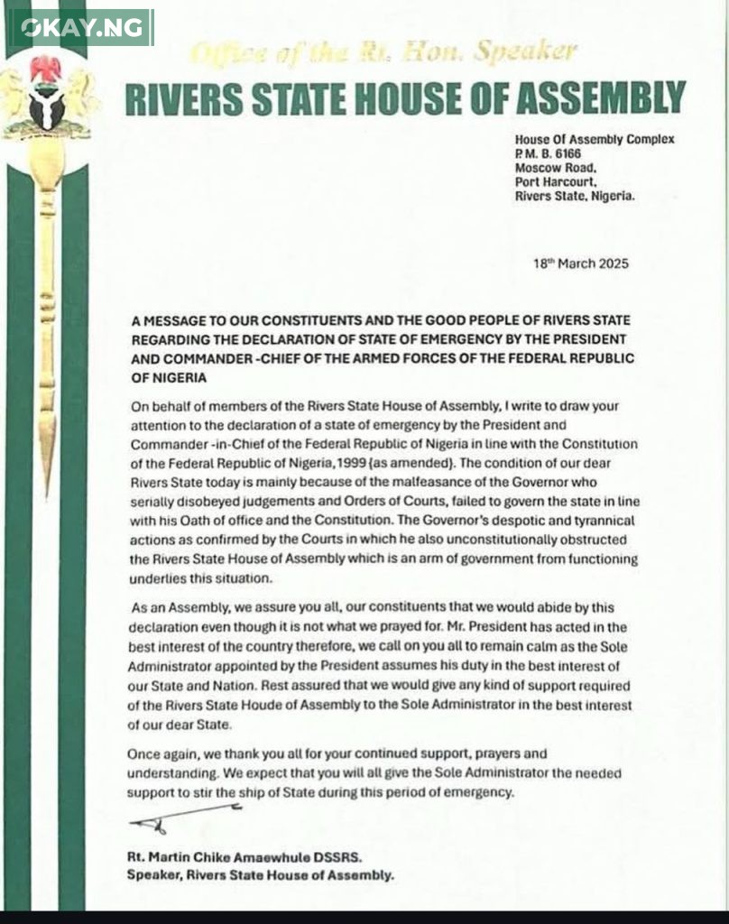 The Speaker of the Rivers State House of Assembly, Rt. Hon. Martin Chike Amaewhule, has issued a statement on behalf of the Assembly members on March 18, 2025, addressing the declaration of a state of emergency in Rivers State by the President and Commander-in-Chief of the Federal Republic of Nigeria.