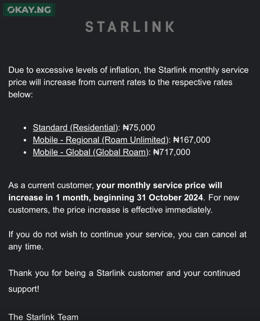“Due to excessive levels of inflation, the Starlink monthly service price will increase,” the company explained in an email obtained by Okay.ng.