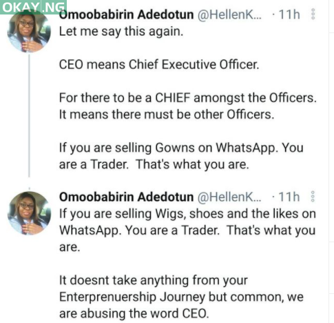 She said, if you’re selling wig or bags on Instagram or Whatsapp group, that doesn’t make you a CEO of a company, rather you’re a trader.