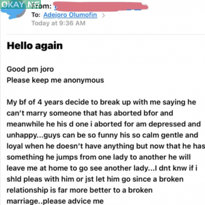 My bf of 4 years decide to break up with me saying he can’t marry someone that has aborted bfor and meanwhile he his d one i aborted for am depressed and unhappy…guys can be so funny his so calm gentle and loyal when when he doesn’t have anything but now that he has something he jumps from one lady to another he will leave me at home to go see another lady…I gnt know if i shld plead with him or jst let him go since a broken relationship is far more better to a broken marriage.please advice me