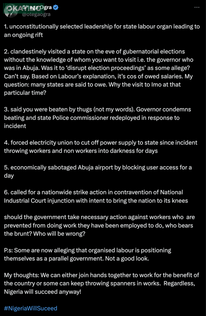 Earlier today, I had decried the events leading to the unfortunate actions by organised labour to embark on their latest strike action here.