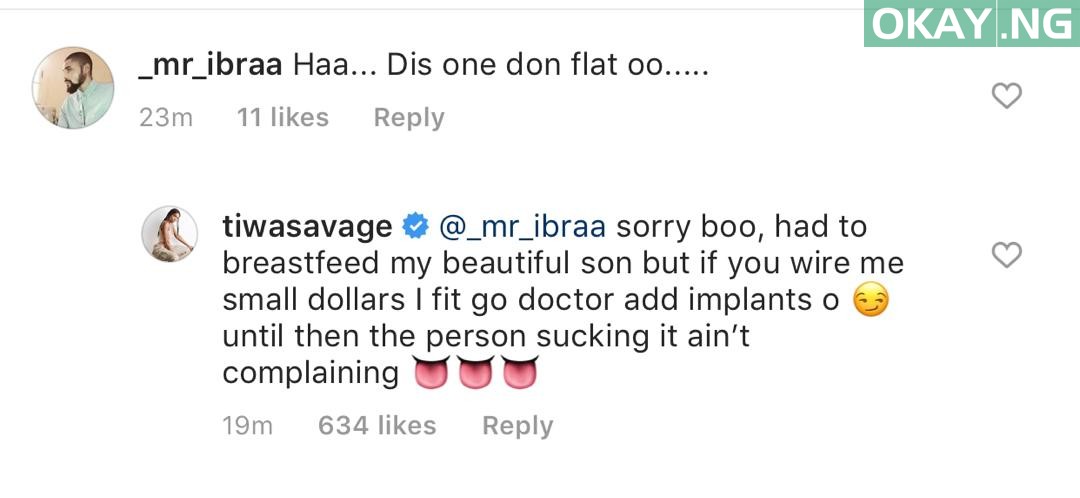 However, this troll commented with “Haa… Dis one don flat oo…..” which prompted to singer to reply “sorry boo, had to breastfeed my beautiful son but if you wire me small dollars I fit go doctor add implants o until then the person sucking it ain’t complaining”.