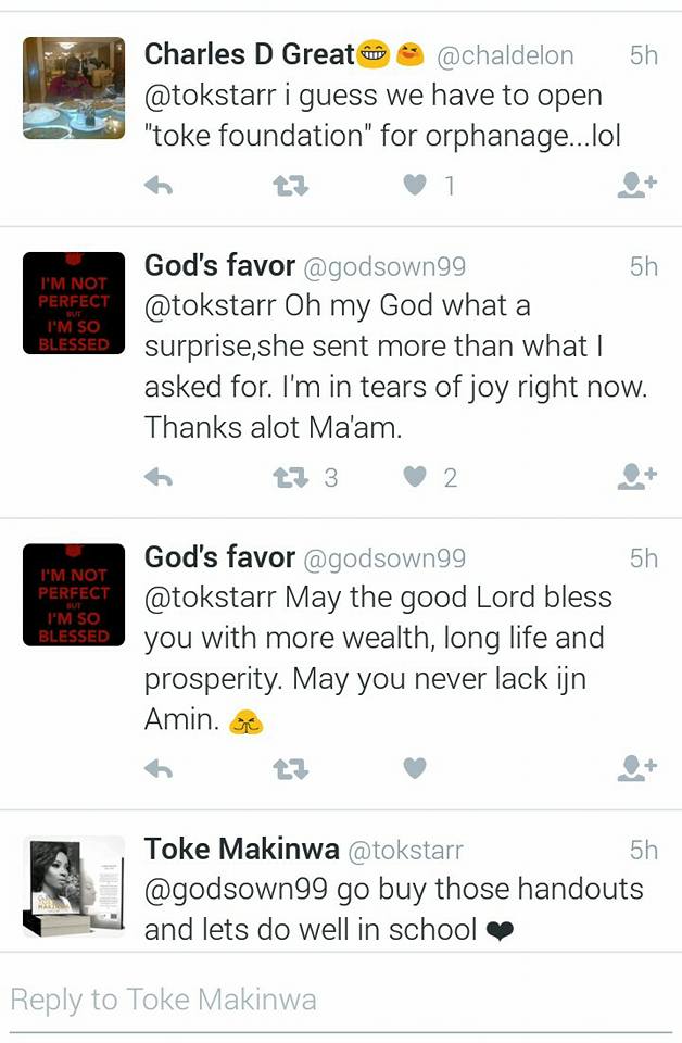 Veteran OAP Toke Makinwa has shown the philanthropic and benevolent side of her again as she helped a twitter user, who asked for her help to cover cost of his handouts as he is already finding it hard to pay his school fees.