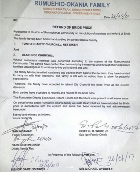 A week ago, Tonto Dikeh revealed in a leaked text that she paid her bride price herself, however, her father has said that Olakunle Churchill fulfilled all traditional requirements and has returned the bride price to him and in so doing has annulled their traditional marriage.